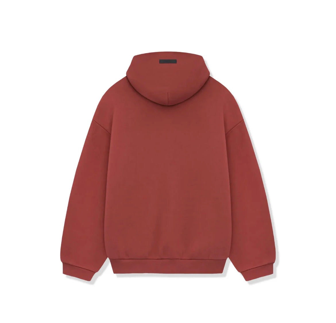 Fear Of God color Crimson presenta un corte oversize, mangas largas, gorro integrado, el logotipo de la marca en la gorra y el gráfico "ESSENTIALS" en la parte delantera y trasera.